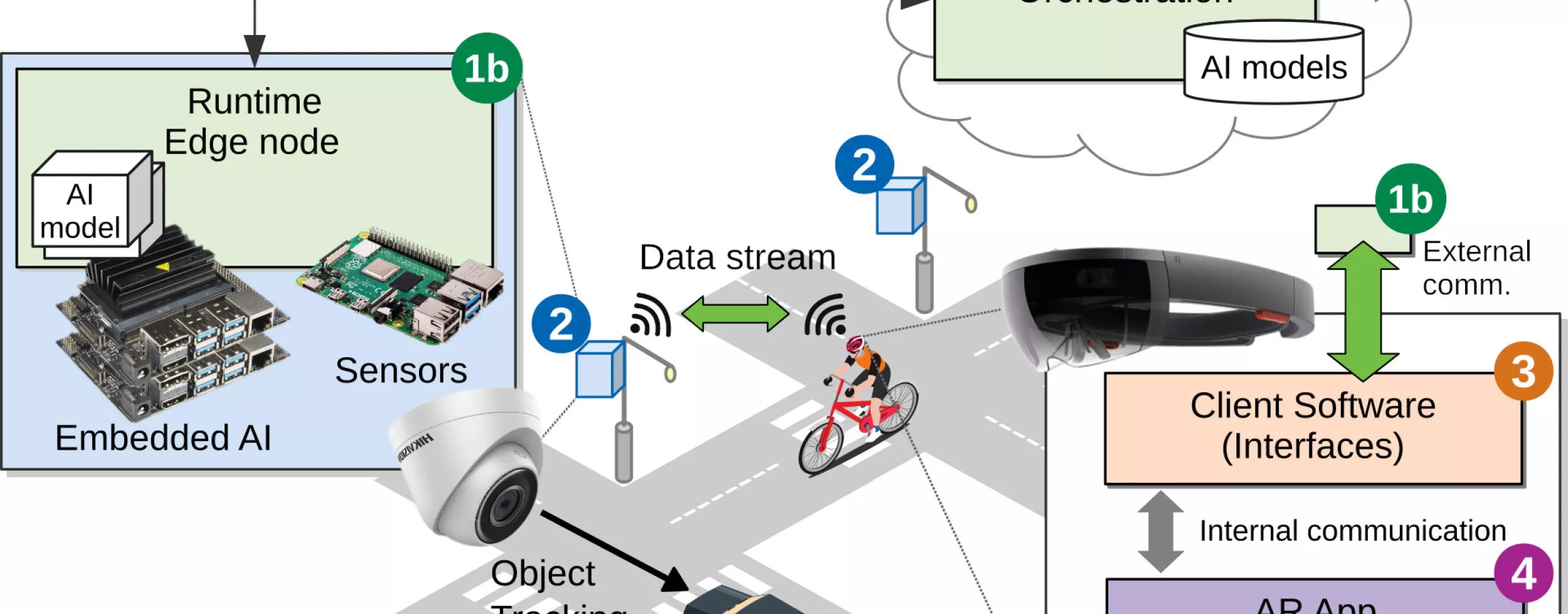 Die folgende Grafik zeigt eine Übersicht über unsere Plattform. Edge nodes (2) ermöglichen durch entsprechende Sensorik und AI Beschleuniger erstens das digitale tracking physikalischer Objekte, und zweitens das verarbeiten von Videodaten der AR headsets. Die Runtime Plattform (1) verwaltet die Ressourcen und die Applikationen die auf der Infrastruktur ausgeführt werden. Die Client Software (3) ermöglicht AR App (4) Entwicklern den transparenten Zugriff auf das System.