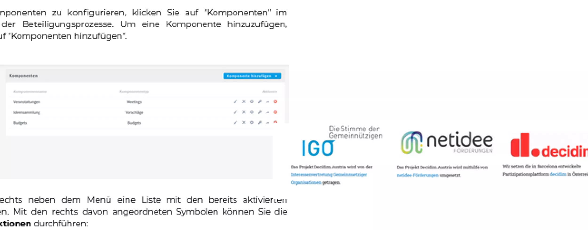 Es ist gut, dass Decidim - wenn man sich etwas Zeit dafür nimmt - sogar im Admin-Interface relativ intuitiv verständlich und mithilfe der derzeit existierenden englischen Dokumentation von Decidim Barcelona gut zu bedienen ist. Zeit ist jedoch kostbar, daher haben wir uns in der Projektplanung dafür entschieden, ein Manual zu erstellen, mit dem zukünftige AnwenderInnen Decidim besser und rascher administrieren können.