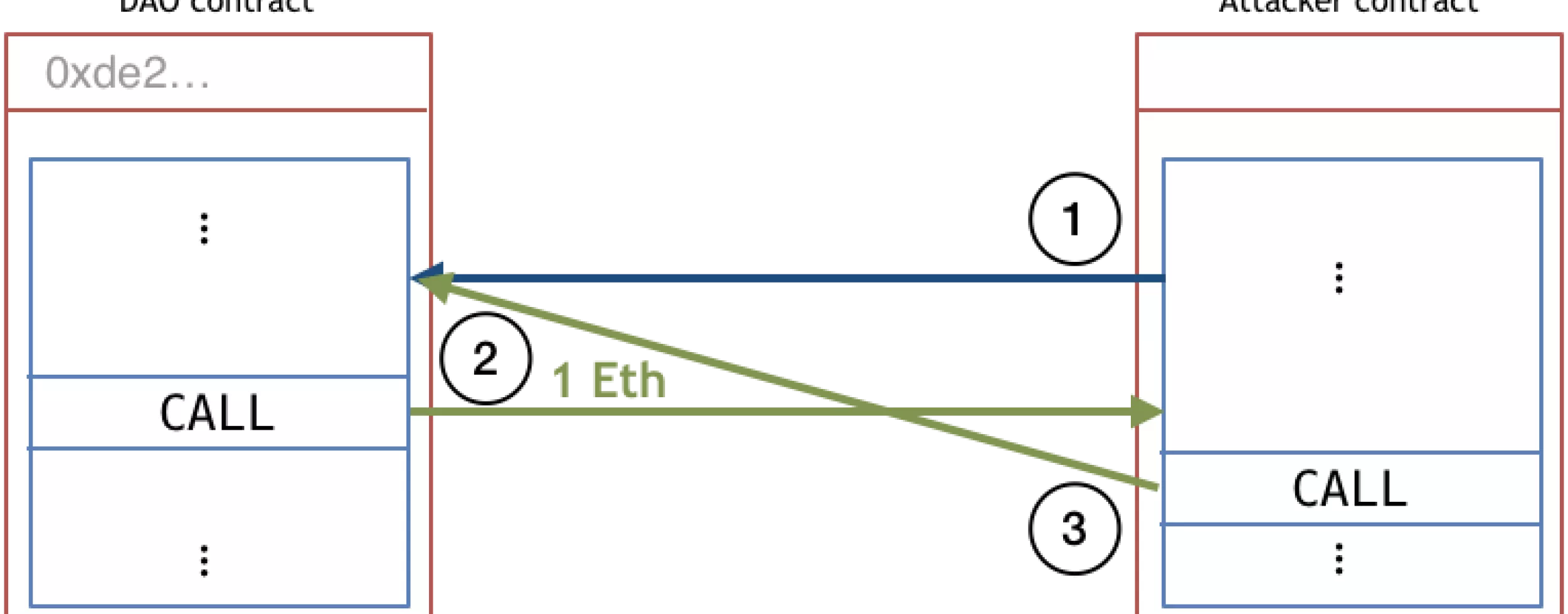Die Nummerierung zeigt die Reihenfolge der Aufrufe: Zunächst wird der DAO Vertrag aufgerufen (1), was später einen Aufruf des Angreifer Vertrags (2) zur Folge hat. In der folge dieses Aufrufst, ruft der Angreifer den DAO Vertrag zurück (3). An dieser Stell wird nun wieder der DAO Vertrag ausgeführt. Der DAO Vertrag ist ist sicher, falls er sicherstellt, dass zu diesem Zeitpunkt die CALL-Instruktion nicht mehr ausgeführt werden kann.