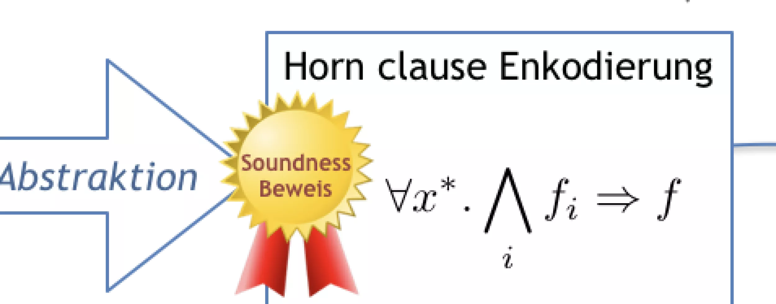 Den Vorteil, den die abstrakte Semantik hat, ist dass wir sie Mithilfe von logischen Formeln (so genannten Horn Clauses) aufschreiben können, für die es schon existierende Lösungsprogramme gibt (so genannte SMT-Solver). Diese Solver können heraus dann herausfinden, ob bestimmte Zustände während der abstrakten Ausführung auftreten können oder nicht.