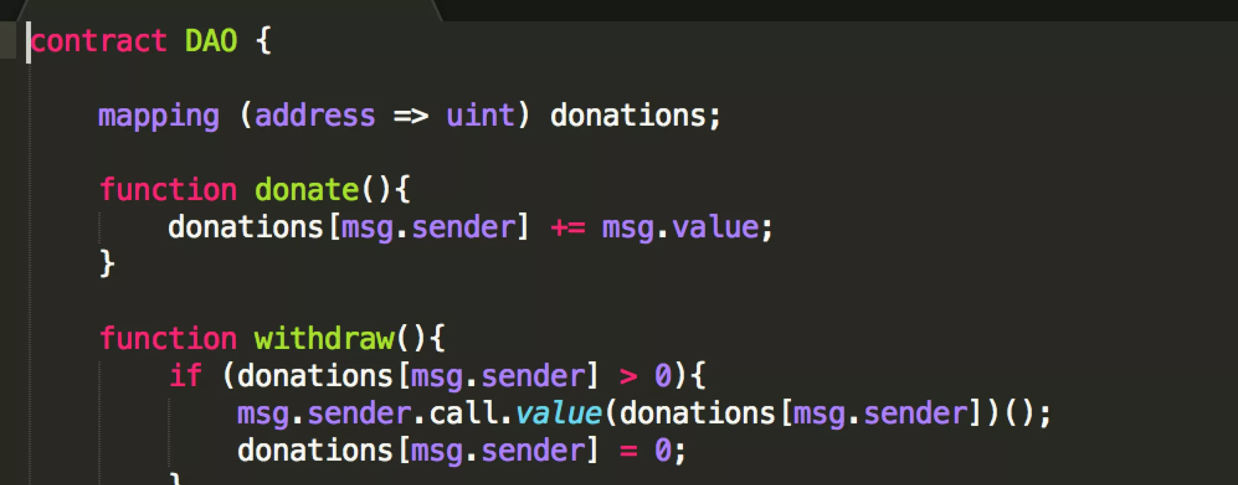 Dieser Contract stellte nämlich eine Funktionalität bereit, damit Spender ihr Geld wieder zurück erhalten konnten und genau diese Funktionalität hatte einen entscheidenden Fehler: Sie erlaubte es nämlich einem Angreifer nicht nur das eigene Geld zurück zu erhalten, sondern auch das Geld von allen anderen Spendern zu stehlen!