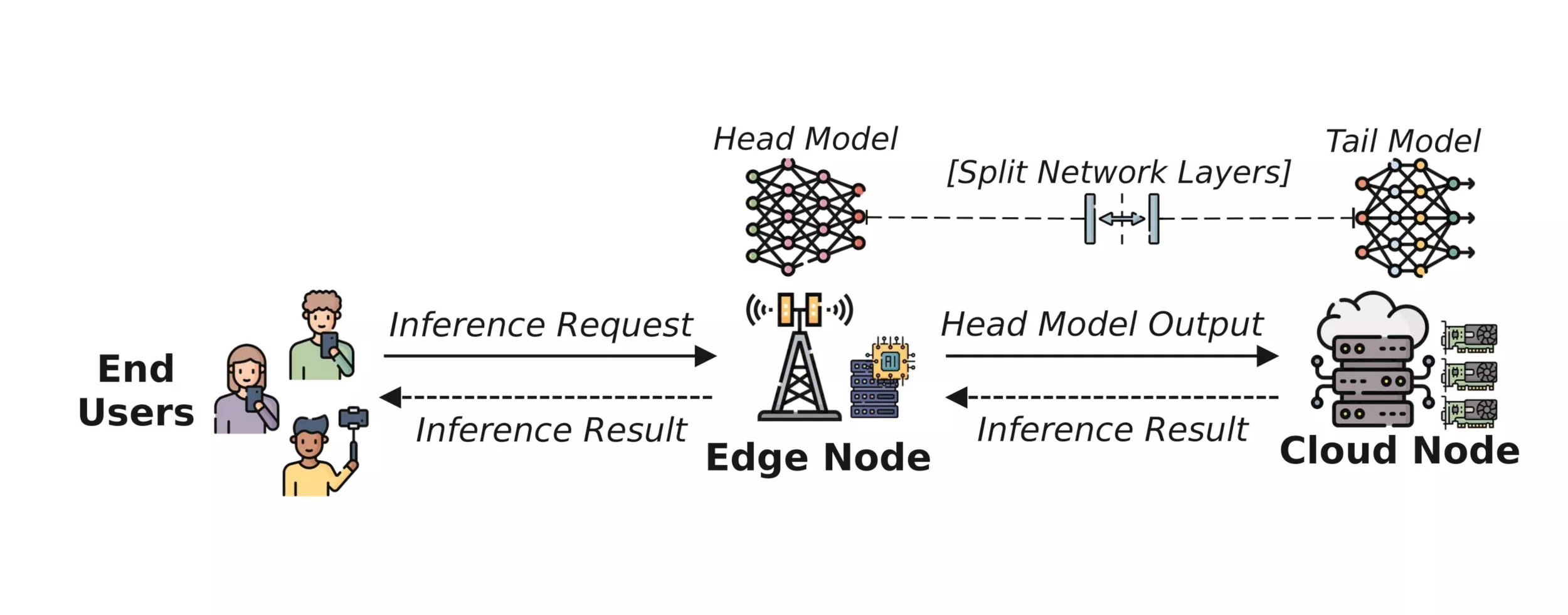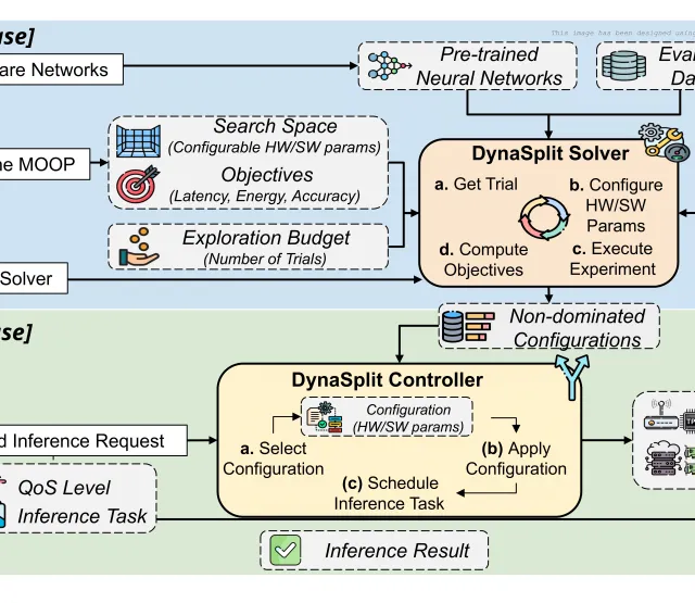 DynaSplit addresses these challenges by jointly optimizing the split point of neural networks - deciding which layers run on edge devices versus the cloud - and hardware parameters such as CPU frequency and accelerator utilization. This dual optimization enables efficient resource utilization while ensuring performance meets Quality of Service (QoS) requirements.