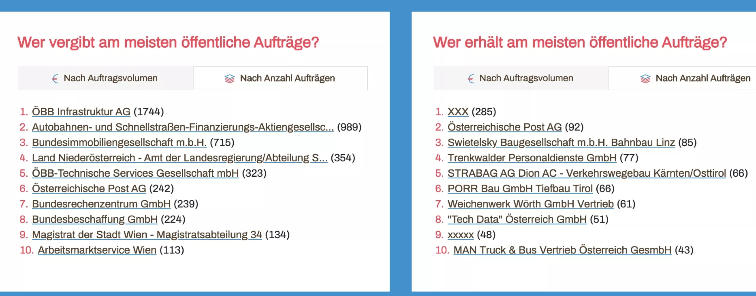 Insgesamt gibt es bereits mehr als 1.300 Auftraggeber in unseren Daten sowie mehr als 3.200 Lieferanten. Es gibt auch zahlreiche staatliche Stellen und Unternehmen im (teilweisen) Eigentum der Republik, die sowohl Auftragnehmer als auch Auftraggeber sind – also einerseits Aufträge an Private vergeben, aber auch Aufträge von staatlichen Stellen übernehmen.