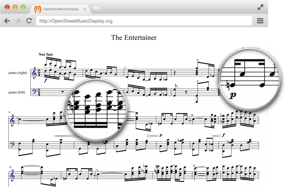 Hier setzt OpenSheetMusicDisplay (OSMD), die erste freie (open source) Notendarstellung in Typescript (Javascript) für Webbrowser, an. OSMD bietet einen musicXML (.xml, .mxl) Import und interaktive Darstellungsoptionen (Zoom, Instrumente ein/ausblenden) für die Notenanzeige. OSMD richtet sich primär an App-Entwickler, E-Learning Websites, Forschungsprojekte und Online-Noten-Shops.