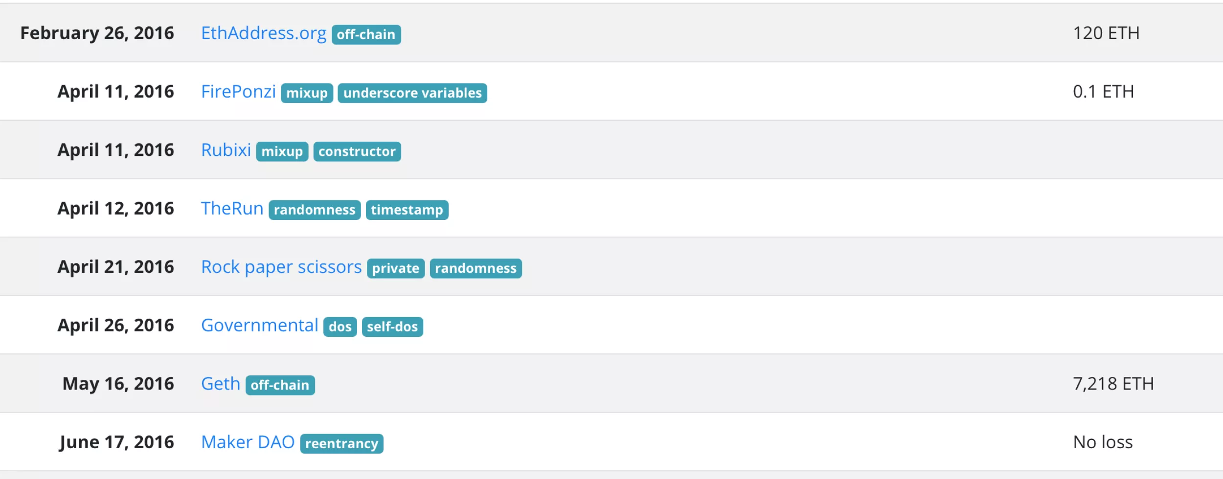 Over the years there have been many examples of vulnerabilities in Smart Contracts that could get exploited. DASP is a curated directory of some of them and a useful resource for studying.