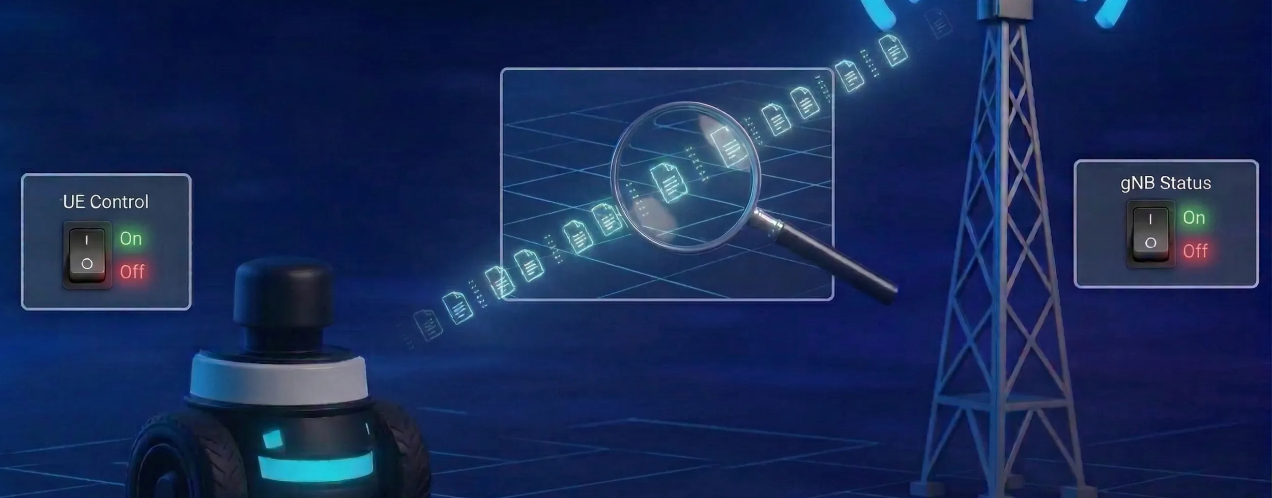 This interactivity makes it incredibly easy to test network disruption scenarios. Want to see how your robot's autonomous navigation handles a sudden loss of the base station? Simply toggle off the gNB process from the GUI and watch the robot's logic react in real time.