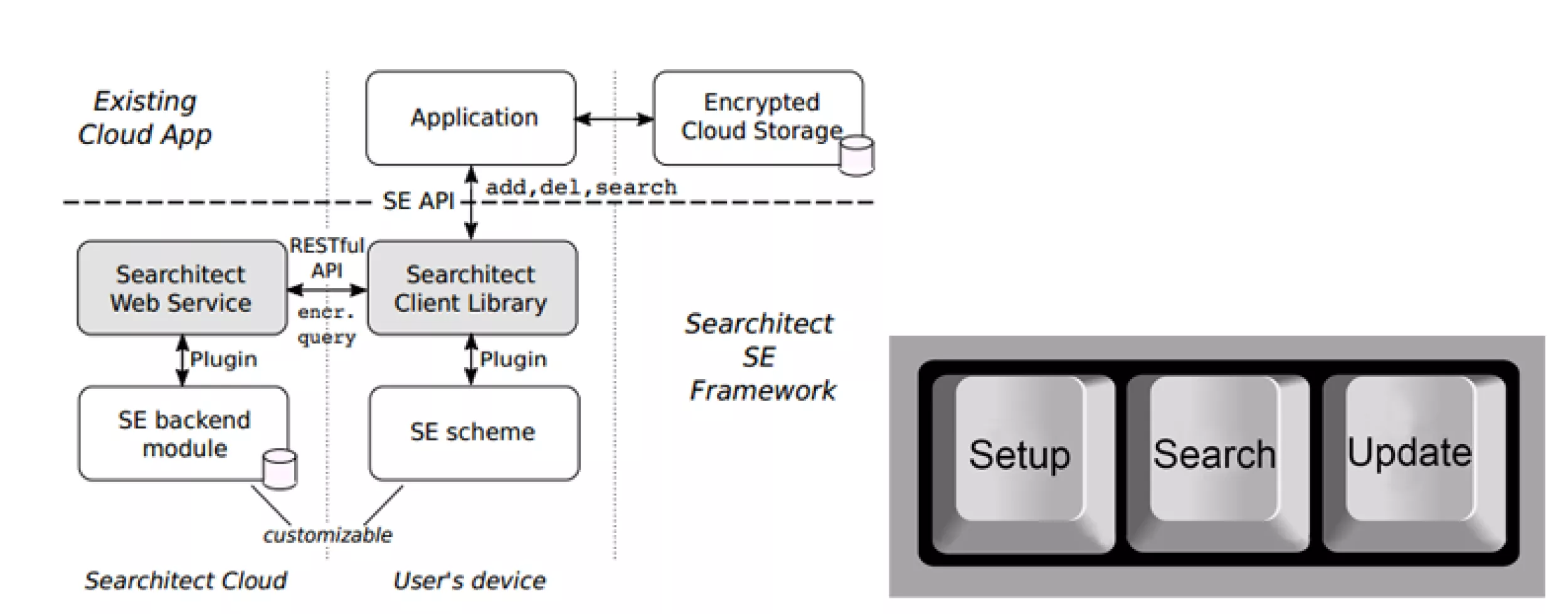 Damit ist gemeint, dass das Searchitect Framework Suchfunktionen und Verschlüsselung des Suchindex für eine Anwendung zur Verfügung stellt, indem der Searchitect Client in die Anwendung integriert wird, die Verschlüsselung der Daten selber aber weiterhin unabhängig davon Aufgabe der Anwendung bleibt.