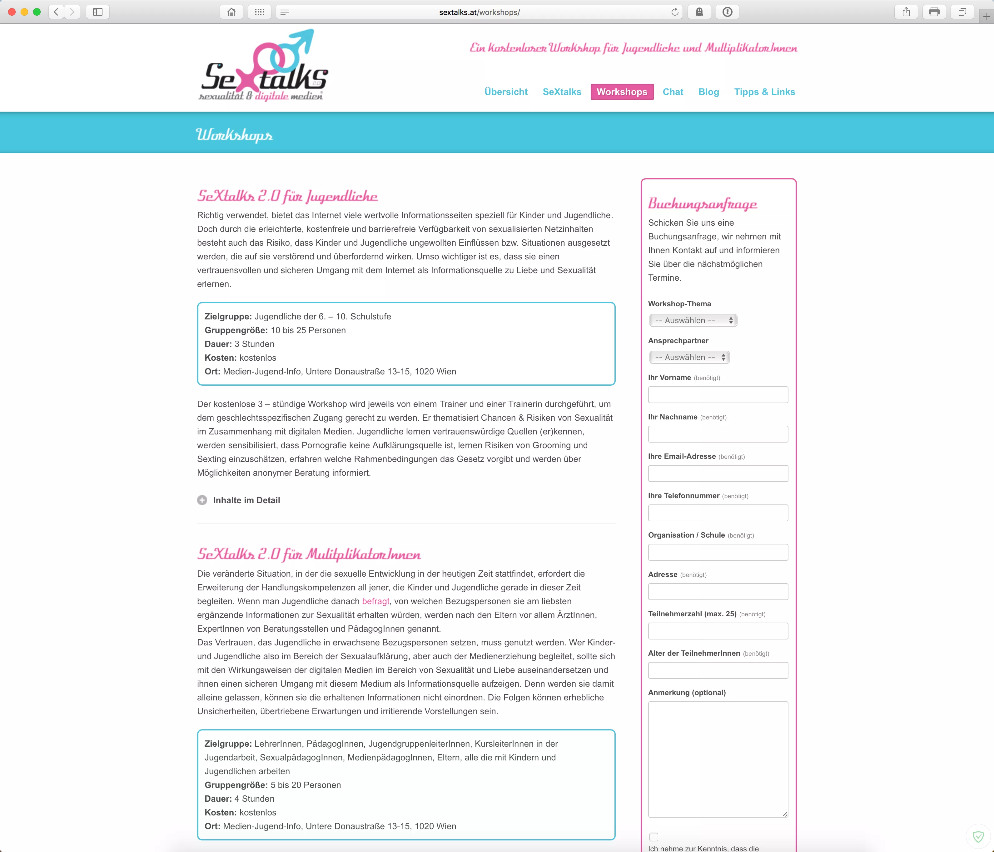 SeXtalks 2.0 ist ein Projekt, das Jugendlichen und MultiplikatorInnen zeigt, wie sie das Internet als Quelle von Informationen zu Liebe & Sexualität in sicherer Art und Weise nützen können. Das Internet ist DIE Quelle, wenn es um Sexualität geht, allerdings verwenden Jugendliche sie meist völlig unbegleitet. Bei SeXtalks lernen sie vertrauenswürdige Seiten sowie gesetzliche Rahmenbedingungen kennen und Risiken einzuschätzen. Gleichzeitig werden konkrete Lösungsmöglichkeiten gezeigt, orientiert an ihrer Lebensrealität mit praktischen Übungen.
