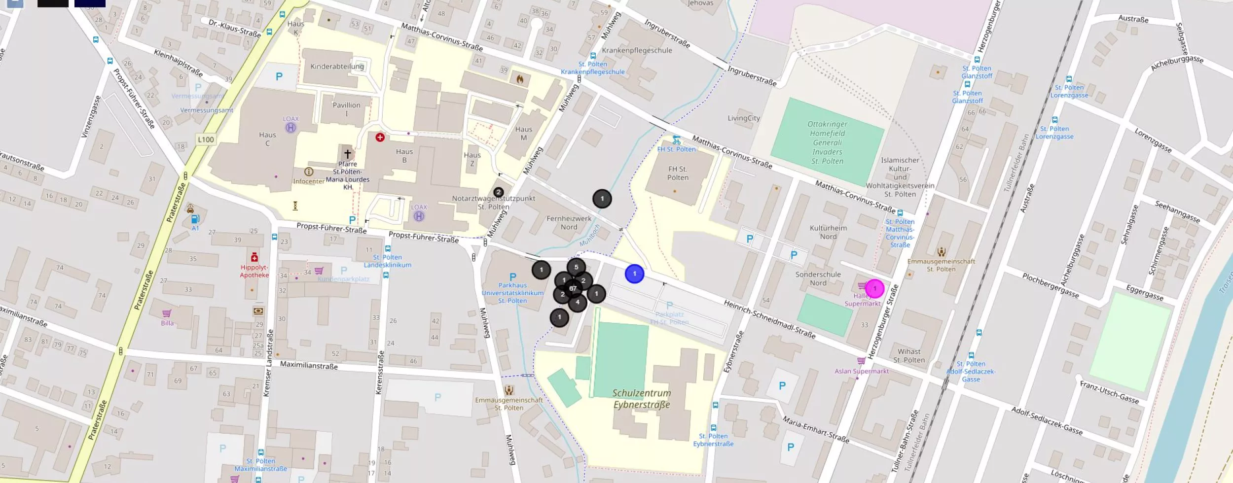 Our map visualization improved significantly since the first prototype. It now has the functionality to filter by technology, address and time; and shows different technologies with different colours. Beside that, the amplitude of the detections is shown by the radius of the circles and the number of detections at one place is shown by the value inside the circle. On click of one of those markers, a small info box pops up on the map.