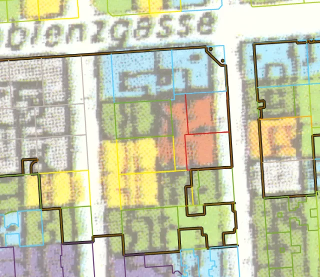 Zunächst wird mit einem georeferenzierten Scan der thematischen Karte, der als Grundlage für die Vektorisierung dient begonnen. Das obige Bild zeigt einen Ausschnitt der Originalkarte in ihrer ursprünglichen Form, detailliert mit den Farben und Formen, die die verschiedenen Gebäude und Gebiete repräsentieren. Dieser Scan ist das Ausgangsmaterial für die nachfolgenden Arbeitsschritte und wird durch die Einbindung von Referenzgeometrien ergänzt. In diesem Fall handelt es sich um Gebäude Footprints aus der Openstreetmap. Der Grund hierfür liegt in der Tatsache, dass es sich bei dem Testausschnitt um einen Baublock aus der Karte "Stadtverfall und Stadterneuerung Budapest" handelt und die Akquise offizieller Daten als schwierig erwiesen hat.