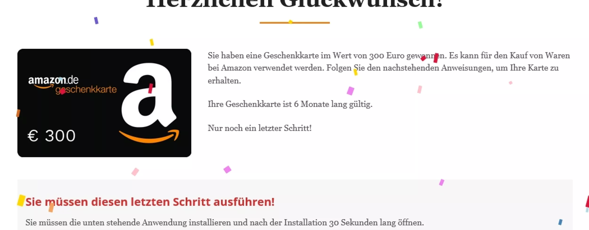 Wird auf „Weiter“ geklickt regnet es Konfetti und die frohe Botschaft wird verkündet: „Herzlichen Glückwunsch! Sie haben eine Geschenkkarte im Wert von 300 Euro gewonnen.“ Ein letzter Schritt muss aber noch ausgeführt werden, um die Geschenkkarte zu erhalten – und zwar der Download einer App.