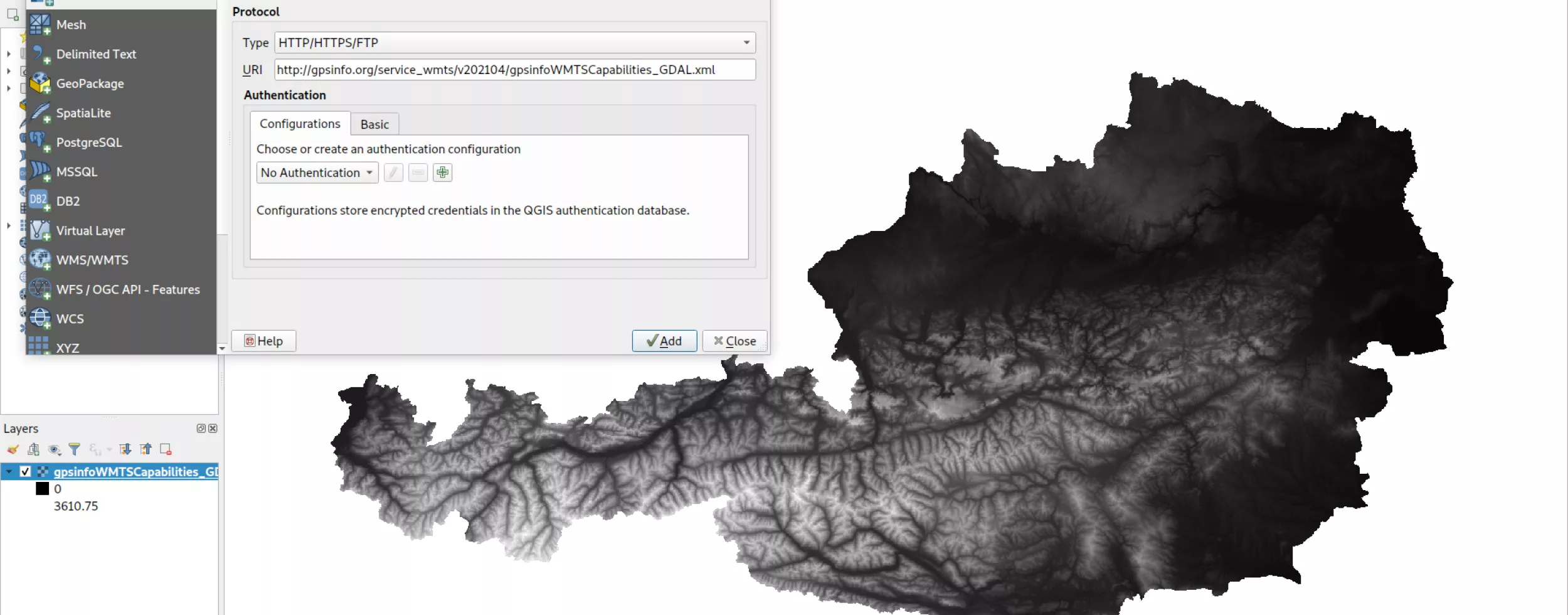 Innerhalb der Linuxversion von Q-GIS konnte auch ein WMTS-Dienst des 10 m Höhenmodells von Österreich mit Erfolg direkt eingebunden werden (siehe Titelbild dieses Blogs). In der Windowsversion von Q-GIS funktioniert das direkte einlesen leider noch nicht.