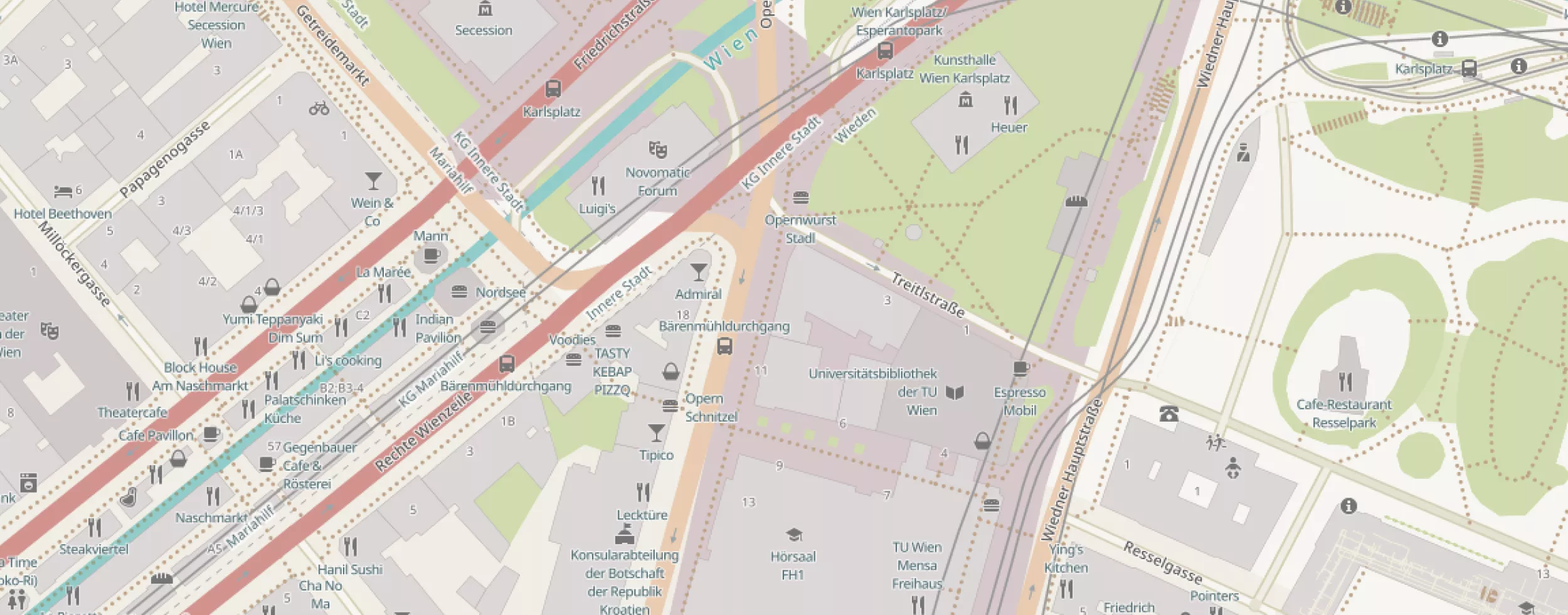 Hier geht Mapbox mehr den Weg von Google Maps. Es wird versucht auf einer klaren Karte, ohne viele Details, einen Überblick zu geben. Meist unwichtige POIs werden ausgespart um die Karte nicht zu überladen. Die Gewerke am Naschmarkt werden aber nur zu einem Bruchteil abgebildet und meist nur angedeutet. Der Fokus liegt hier, wie der Name schon sagt, auf Straßennavigation. Das sieht man auch an der Kennzeichnung der B1, der Rechten Wienzeile bzw Friedrichstraße. Es werden Parks grün hervor gehoben, Grasflächen bleiben aber unbeachtet. Öffentliche Verkehrsmittel finden, mit Ausnahme von U-Bahn Stationen, keine Erwähnung. Nur Schienen, die einem beim Autofahren auffallen könnten werden dünn gezeichnet. Bei Gebäuden wird kein Unterschied zwischen öffentlich oder nicht öffentlich gemacht.